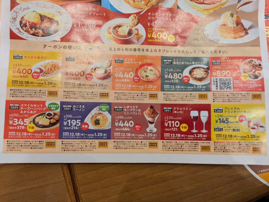 今手元にあるのは2025年12月18日から2026年1月25日までの期間で、無料おこさまドリンクバーのクーポン番号は「5071」ですね。