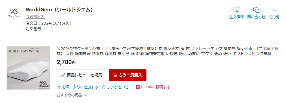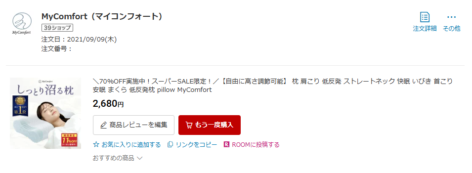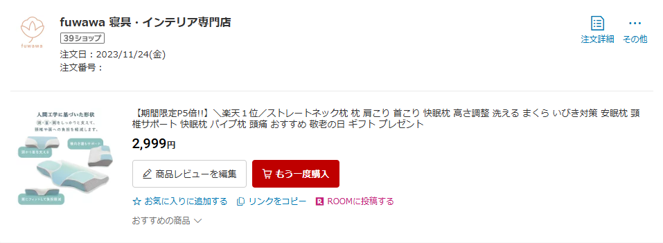 返品直後はまくらぼからの返金があったので、すぐにストレートネック枕を買いました。