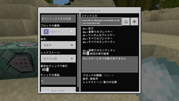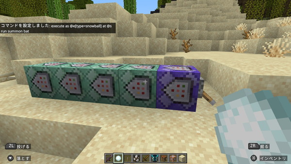 にしたら、雪玉にコウモリを召喚させるコマンドを入力していきます。