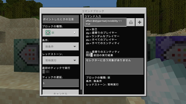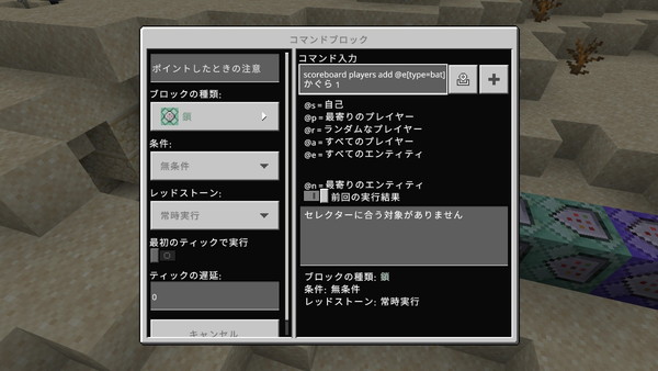@e[type=bat]でコウモリのスコアだけに足していかないと、重くなって動けなくなるので注意です。