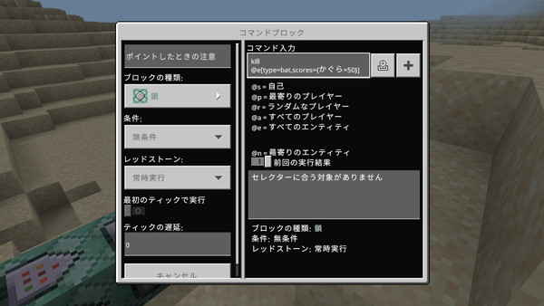 になります。最後の@e[type=!player,type=!bat]がないとプレイヤー自身やコウモリが死んじゃうので、気を付けましょう。