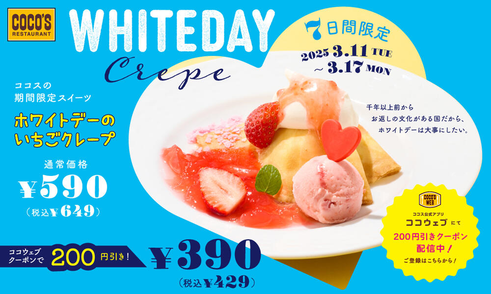 3月のココス期間限定スイーツは「ホワイトデーのいちごクレープ」です。