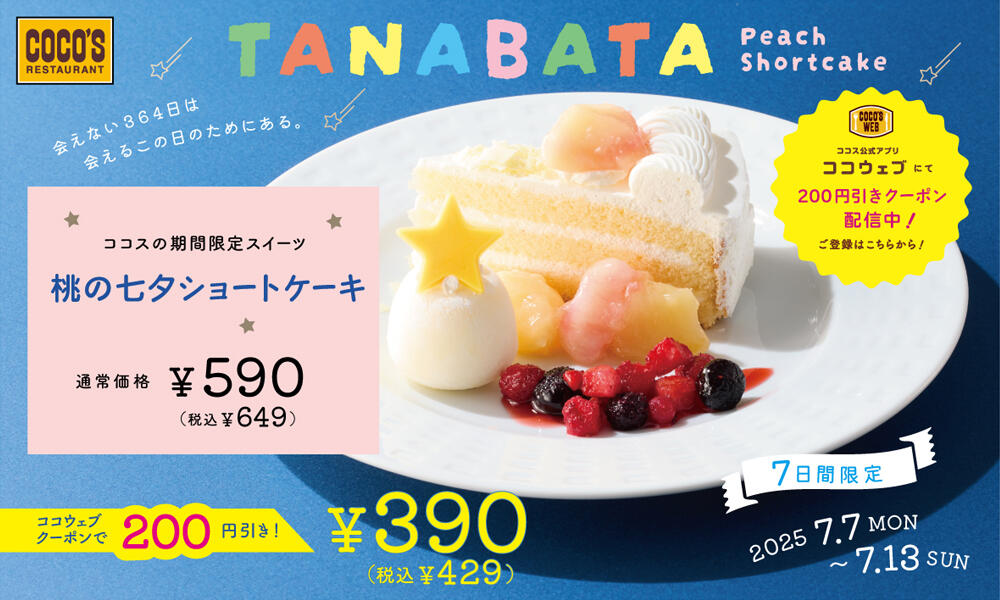 7月のココス期間限定スイーツは「桃の七夕ショートケーキ」です。
