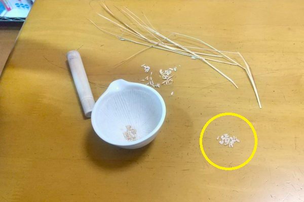 そして、籾から硬い籾殻を取り除いて玄米にする籾すりも、すりこぎとすり棒であっという間でした。
