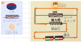 ①リードスイッチがONのときは抵抗が大きいLEDには電気が流れず電磁石の磁力が強くなり